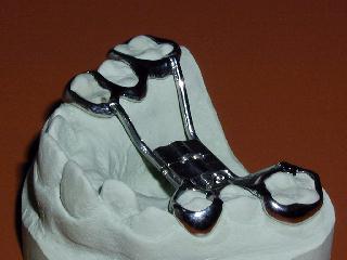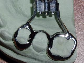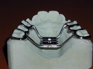aufzementiert. Die Zähne werden mit Modellguss gefaßt und die Gaumennahtsprengschraube,